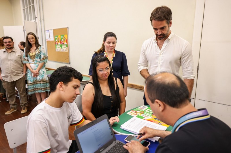 Governador Eduardo Leite acompanha primeiro dia de entrega dos cartões do Programa Pé no Futuro a estudantes da Rede Estadual